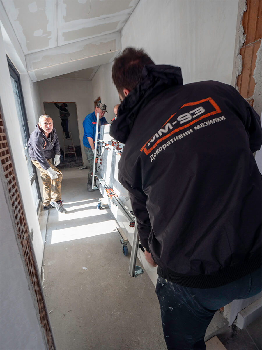 В ход са довършителните дейности в нова луксозна къща в гр. Пловдив. Всички вътрешни ремонти са поверени на ММ-93. Бани с широкоформатни плочки, стълбища с гранит, подове с гранитогрес, стени и тавани с гипсокартон, декоративни мазилки, декорации, декоративни елементи, и корнизи.