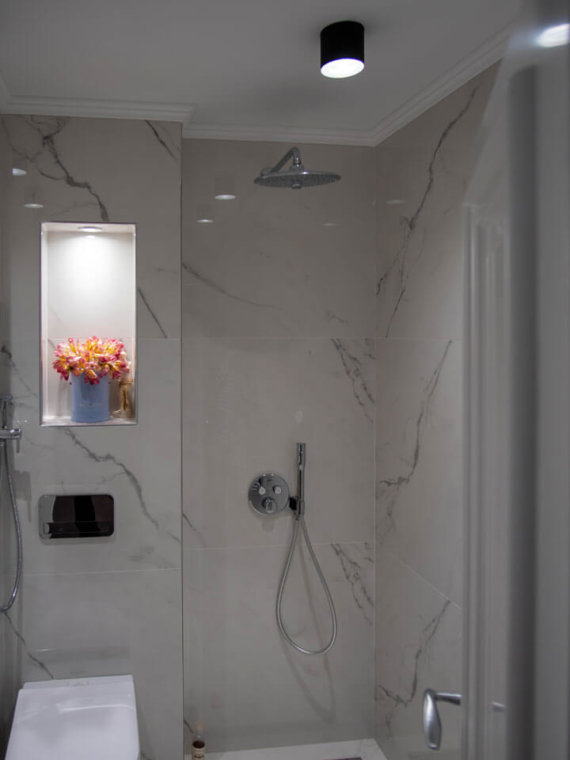 В апартамента се поставят голямоформатни плочки 120х120см. на пода, и 280х120см. в баните и на стените.