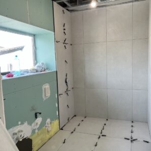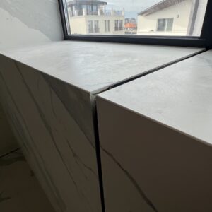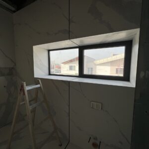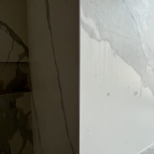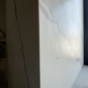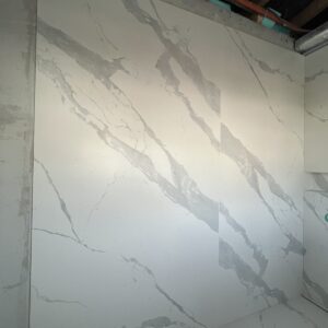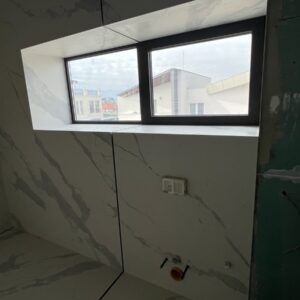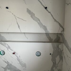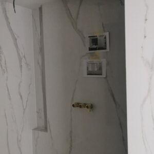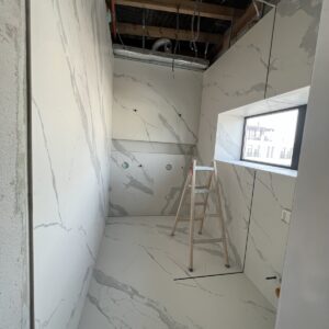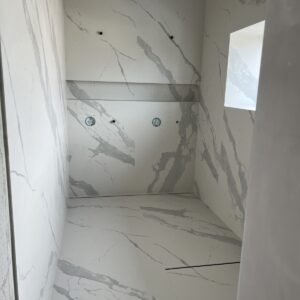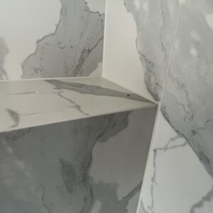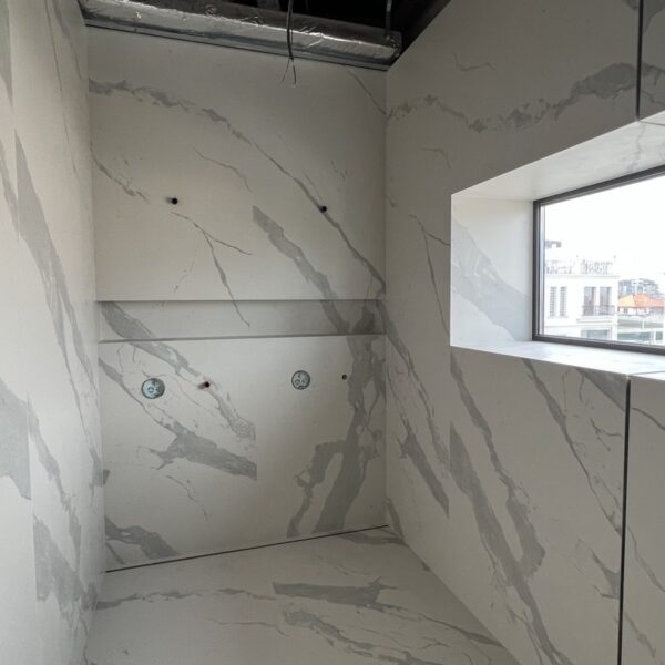 ММ-93 се утвърди като лидер в декорациите, декоративните мазилки и монтажа на голямоформатни плочки. Перфектната облепената баня се постига с добри монтажисти и с наличието на точните инструменти Представяме баня с голямоформатни плочки 160/320см. и множество ниши. Всички те са обработени под ъгъл от 45° със специални диамантени фрезери.