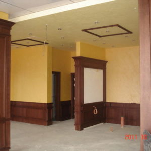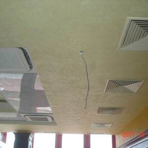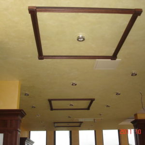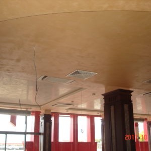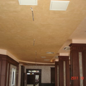 По тавана, в декоративните правоъгълници от гипсокартон, е нанесена мазилка Рафаело Мадреперлато отново на фирма Ойкос. Тя е създадена, така че да наподобява мазилките, украсяващи стените от фиорентинските дворци.