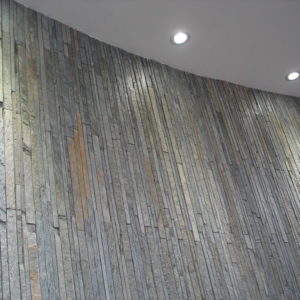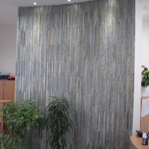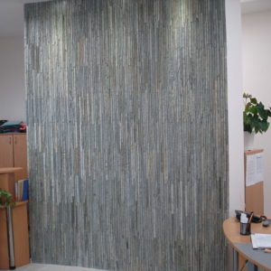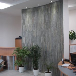 Направихме декоративна стена в новата сграда на Styler. Там използвахме естествен камък от много рядка червена туфа, рязана на ивици от сантиметър от мрежата.