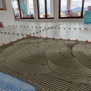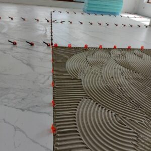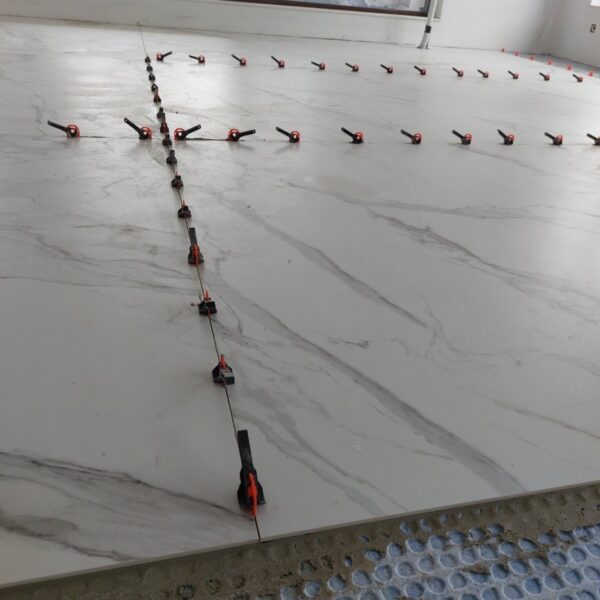 В този проект за монтаж на голямоформатни плочи 160/320 см., ние от ММ-93 използваме усъвършенстваната система за нивелация на плочки Magnefix, без която монтажа на големи плочки е неизпълним.